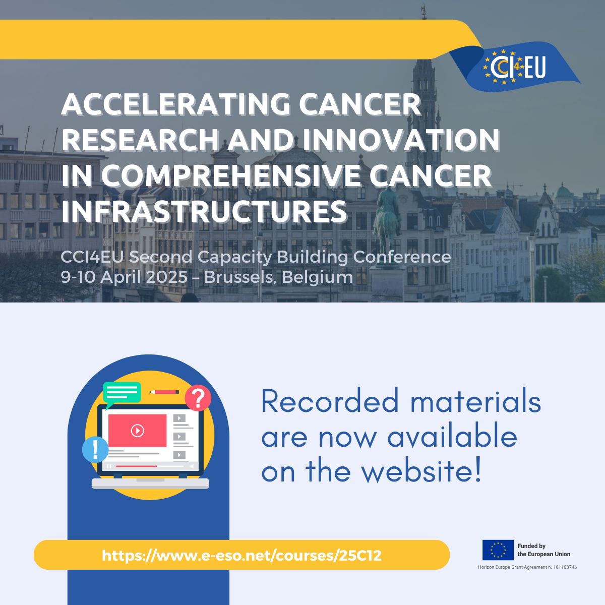The Conference Accelerating cancer research and innovation in comprehensive cancer infrastructures was held in Brussels, Belgium, on 9 and 10 April 2025 and all interventions were recorded and are now available via these pages (to access the material, participants must register to the online course, login to the e-ESO platform and click on the PLAY buttons inside the programme). The event gave individuals and teams from developing CCIs direction in helping them build their capacity and develop their infrastructures.