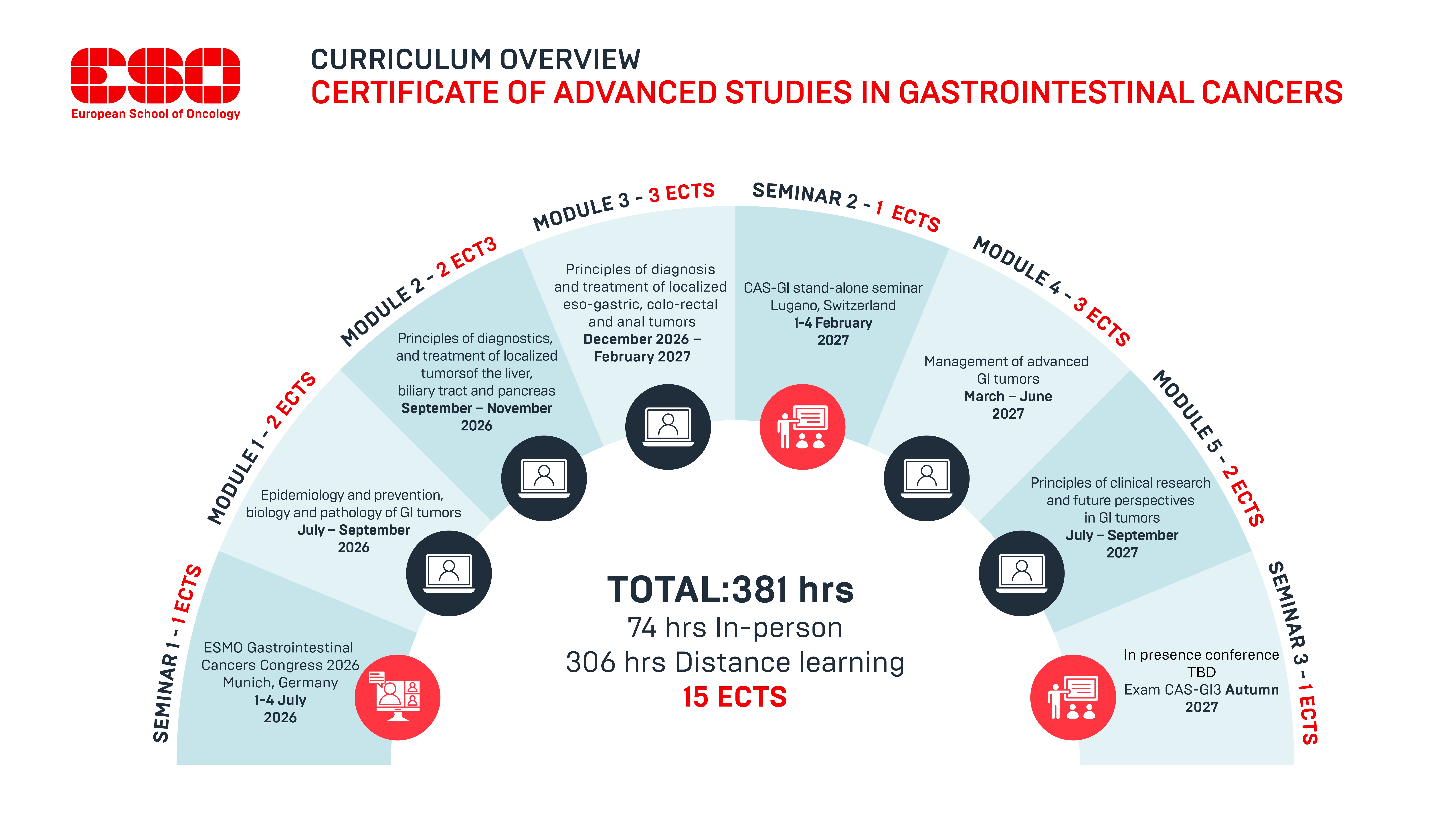 - Structure: 5 online modules & 3 in presence seminars: participation in ESMO Gastrointestinal Cancers Congress, 4-day-CAS-GI stand-alone seminar 2025, Third Seminar TBD